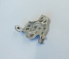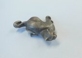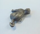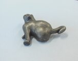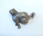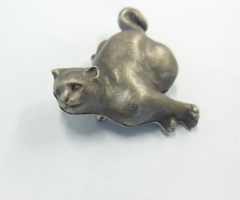 猫のブローチです。一枚の板から立体を作る打ち出しという技法で作成しています。銀のいぶし仕上げ+梨地仕上げにしてあり、落ち着いた渋い雰囲気になっています。後ろ足で掻こうかなと首をひねった一瞬のポーズで、肉球など細かなところまで作りこんであり、猫好きな人なら持っていて飽きないかと思います。