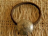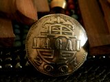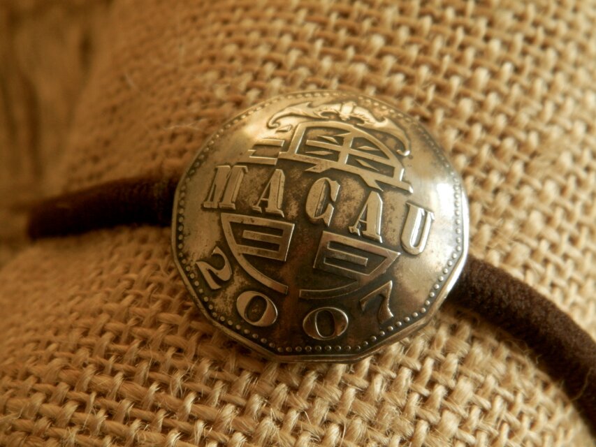 マカオの5パタカコインをヘアゴムと芯合わせしコンチョ型に加工した作品です。