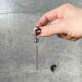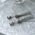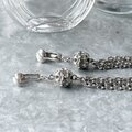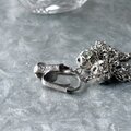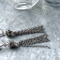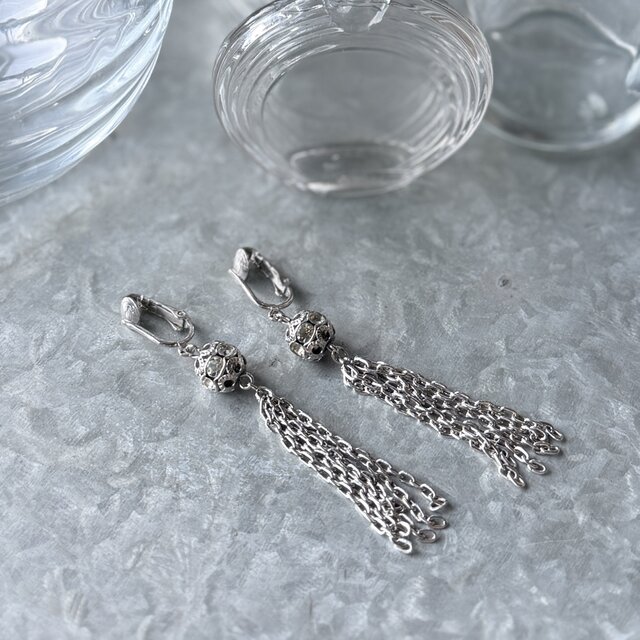 シルバーカラーの透かし彫りボールに、クリアなラインストーンが埋め込まれ、複数のチェーンが垂れ下がったタッセルスタイル。