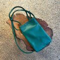 グリーンの牛革と日本の伝統的な着物生地が美しく調和したスマホポシェットができました。