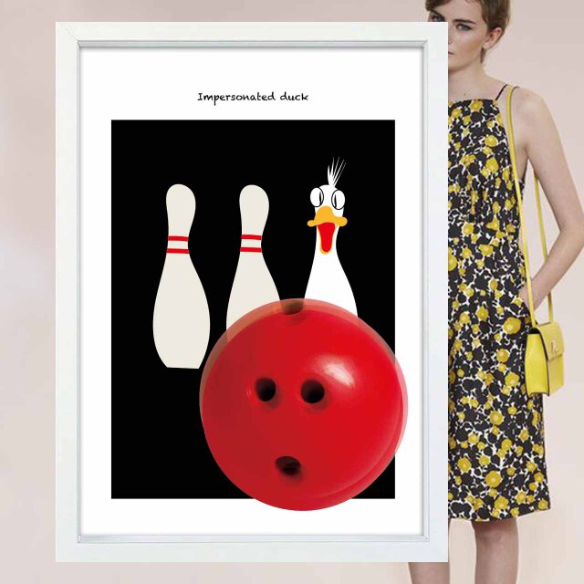 ピンになりすましたアヒルさん ギョッ ボールが向かってきたポスター。