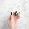 中央に配されたマーキスシェイプのグリーンガラスストーンを主役に、