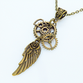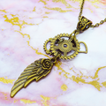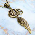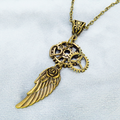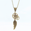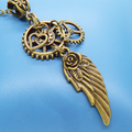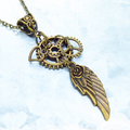 翼のモチーフと大小形状の異なる歯車を組合せたスチームパンク風のネックレスです