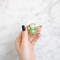透明感のあるグリーンガラスと、柔らかなミルキートーンのストーンを組み合わせ、