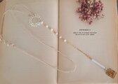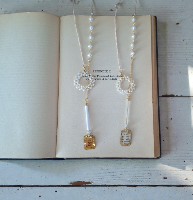 素材▶ヴィンテージビーズ、コットン糸、真鍮、古書紙片、淡水パール、レジン、金具