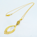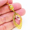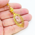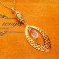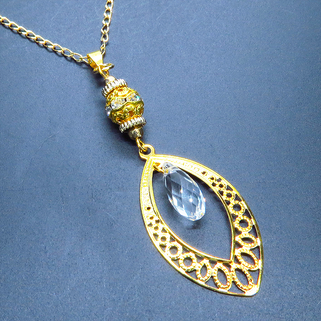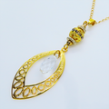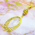 華やかなゴールドカラーのフレームに、繊細なアラベスク調の透かし模様をあしらったティアドロップ(しずく型)モチーフのペンダントです