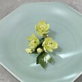 小ぶりの花3輪に、これから咲きそうなつぼみをつけて、小枝のコサージュに仕上がりました。
