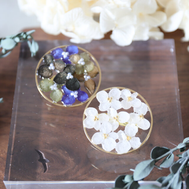 30mmのラウンドゴールドのパーツの内側にアジサイを配置し