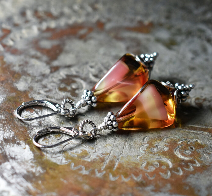 滑らかなフォルムの三角錐の形をしたビーズはフランス産のヴィンテージビーズです。1930~1940年代に作られたものです。