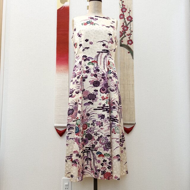 布の風合いや柄の流れを活かしながら、洋の装いとして生まれ変わらせたプリンセスラインのワンピースです。