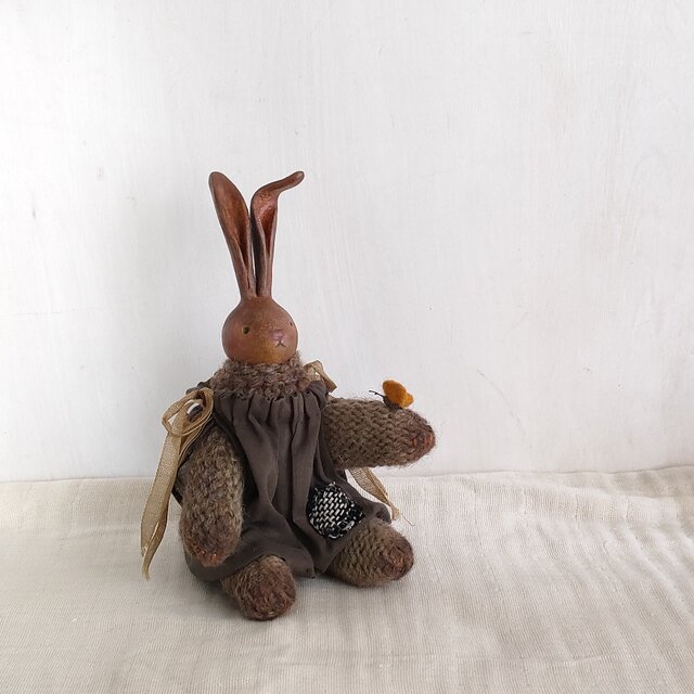 ウール国産毛糸(メランジあり)、化繊綿、木材と針金(頭部・耳接続)、リボン、糸、などなど