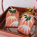 笹の葉が描かれた袋にあわせ、緑の笹を金襴生地で作り、和の落ち着きと可憐な華やぎをあわせ持つデザインに仕立てました