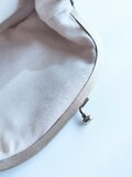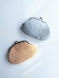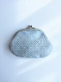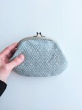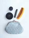 経糸に白い綿糸、緯糸にくすんだ水色の麻糸(苧麻)を用いたオーバーショット織りの生地を、曲線が美しい櫛型の口金と合わせて、オーバル型のポーチに仕立てました。