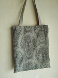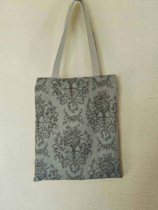 グレイがかったモスグリーンの地にエンジェルと薔薇のアンティーク柄のトートバッグです。