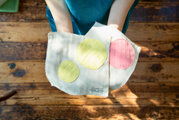 ○の部分は柔らかなガーゼを手作業で裁断、縫製しているため、少し形がいびつになりますがそちらの風合いも楽しんでいただけますと幸いです。