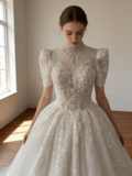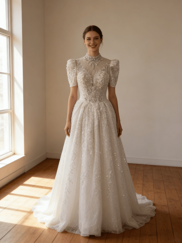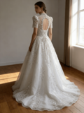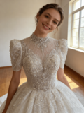 豪華!ウェディングドレス 韓国風ドレス 短袖 キラキラ光る刺繍 背中見せ ミニトレーン 結婚式