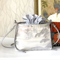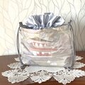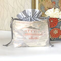 バッグの入れ口はシルバー色サテンの巾着となっており、上品で華やかでありながら、防犯面でもすぐれています