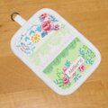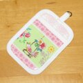 グリーンと白とピンクのボーダーに、花と鳥が描かれた生地で作りました。