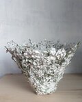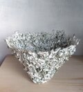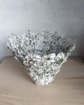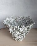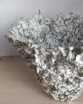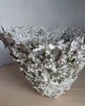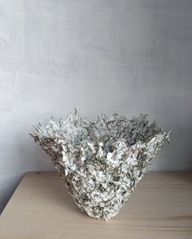 クリスマスリースによく使われるコニファー・ブルーアイスの葉を刻んだものと、飲料の紙パックから作ったパルプで、ペーパーマシェの手法で作製したボウルです。