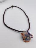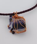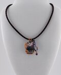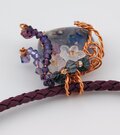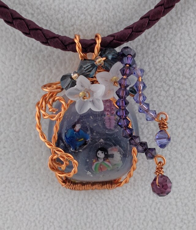 殿方と姫のパーツを埋め込んだとんぼ玉をワイヤーで包み、アクセサリーに仕立てました。中のキラキラはプラチナ箔です。