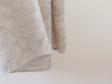 表側は極細の薄いグレーのキッドモヘア、内側はオフホワイトのカシミヤ混ウールを二重に編み機で編みました。