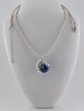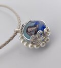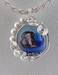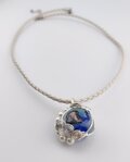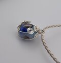 人魚姫のパーツを埋め込んだとんぼ玉をワイヤーで包み、アクセサリーに仕立てました。中のキラキラはプラチナ箔です。