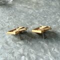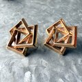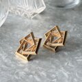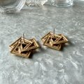 ゴールドトーンのスクエアとトライアングルが複雑に重なり合った、彫刻的な3Dデザインピアス。