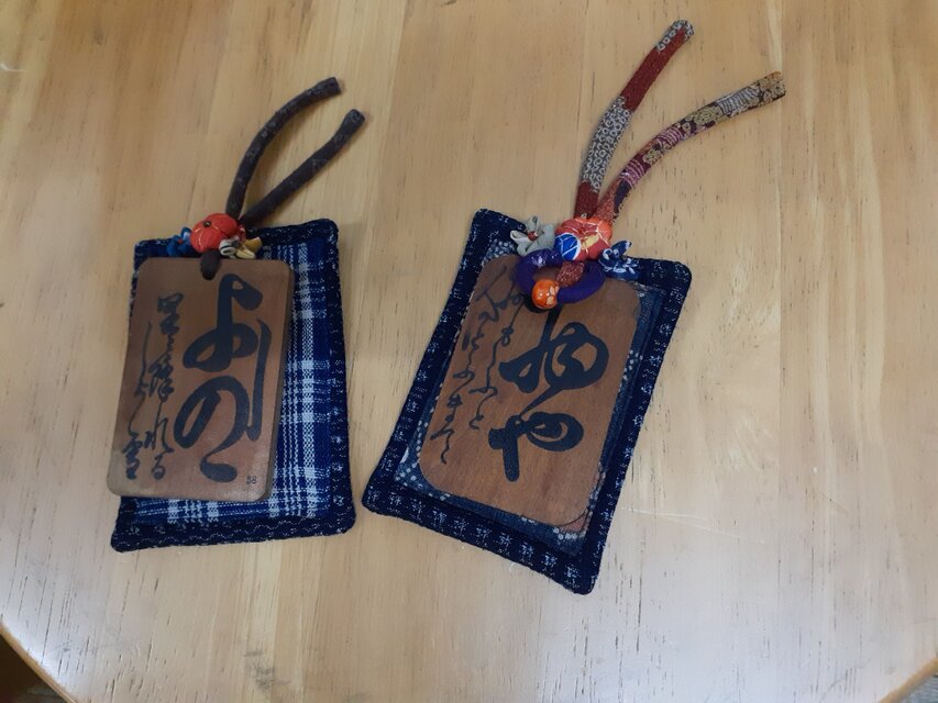 古い木札を柿渋染めして古布をあしらい飾りにしました バックの飾り、ペンダントにしても面白いです 柄はお任せとなります 一つのお値段となります 7㎝×10㎝