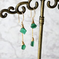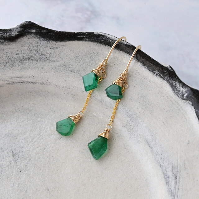 こちらは深いグリーンが印象的なエメラルドを左右2粒ずつ使用。極細の14kgfチェーンをあわせて揺れ感が楽しめるピアスに仕立てました。グリーンとゴールドが醸し出すエキゾチックなヴィンテージ感とボヘミアンスタイルをお楽しみいただけます。フックはオリジナルのハンドメイドで、一つひとつ丁寧に仕上げています。