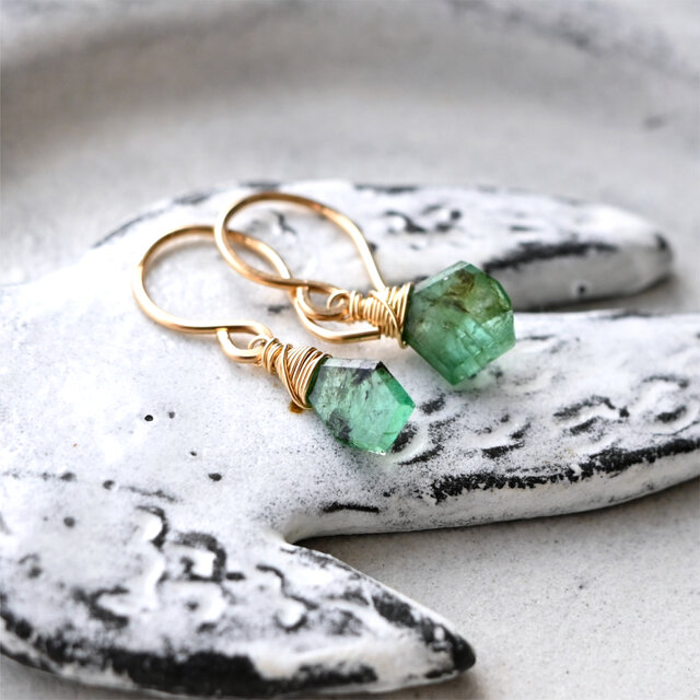 新緑を連想させるような鮮やかなグリーンカラーが美しいブラジル産宝石質エメラルドを使用したピアスシリーズ。程よく内包物が入ったナチュラルな姿、眩い艶と輝きがとても魅力的です。ラフなスライスカットで縁もカットされており光を反射する姿がとても綺麗です。