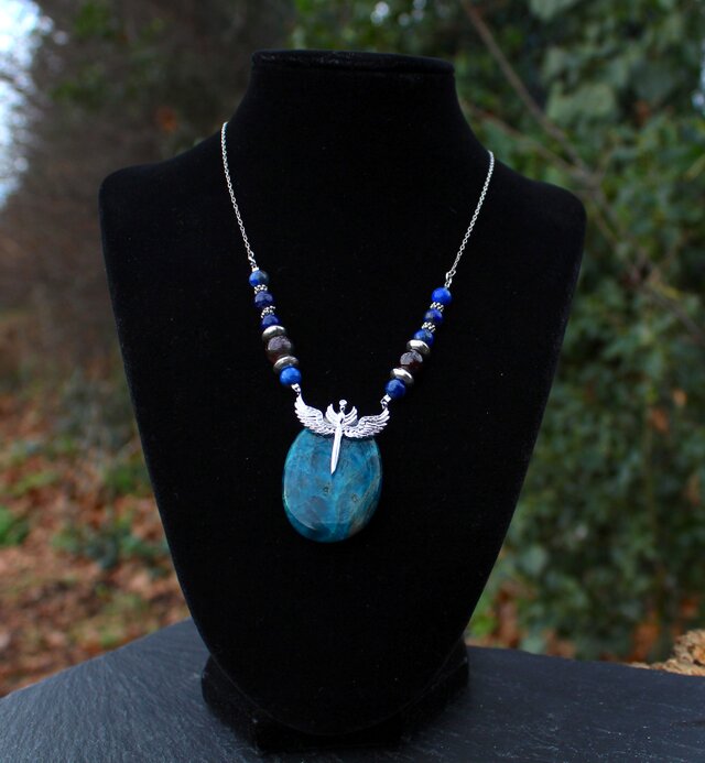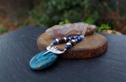 普通に見られるアパタイトは弗素燐灰石を指し、燐酸カルシウムに弗素が加わったものですが、フッ素が塩素に置き換わった塩素燐灰石という種類も存在しています。また、その両方が混ざった固体も存在しており、種類の判別が難しいことがあります。含有元素によって無色・ピンク・赤・黄・緑・青・紫など様々な色がありますが、アクセサリーとして一般的なのは、ブルーアパタイトです。同じブルーアパタイトでも、深い青色のものから、透き通るような透明感の青緑色をしたものまで様々です。アパタイトの名称は、この鉱物の形状が様々であり、晶癖も一定していないことから、ごまかし、トリック、策略の意味のギリシャ語、“apate ”に由来します。これは、アクアマリン・クリソタイル・紫水晶・蛍石・トルマリンなど他の鉱物と見間違えやすかったためと言われています。(A.G.Werner, 1786)