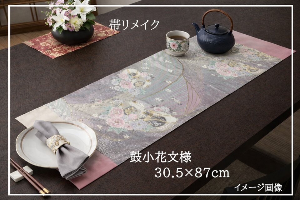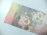 ■新品の帯をリメイクしました。シルバー地に鼓と小花文様で淡い色合いで色糸金糸が美しく高級感のある帯地です。
