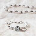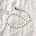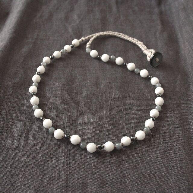 カットがキラリと輝く真っ白なホワイトジェードに淡いグレーが上品な色合いのグレージェダイト(黒翡翠)とダークグレー色のメタルのようなキラキラと輝くヘマタイトを合わせ、グレー色のシルクコードでオールノットで繋いでいます。ネック部分はシルクコードとライトグレー色の綿の糸を編み込んでいます。