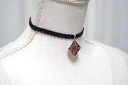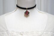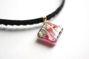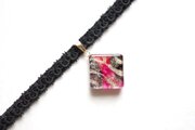 黒とピンクと赤、そしてゴールドのラインがなんとも華やかで、ビビットなのに上品なカラーリングのレジンを、ベルベットリボンにタティングレースで装飾を施したチョーカーに仕上げました。