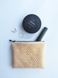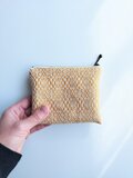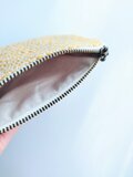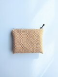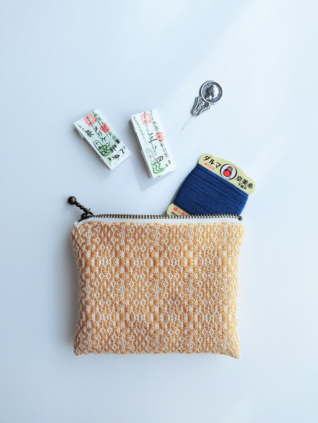 経糸に白い綿糸、緯糸にはパッと気分が明るくなる山吹色の麻糸(苧麻)を用い、オーバーショット織りでミニポーチに仕立てました。