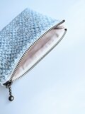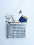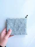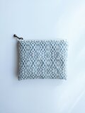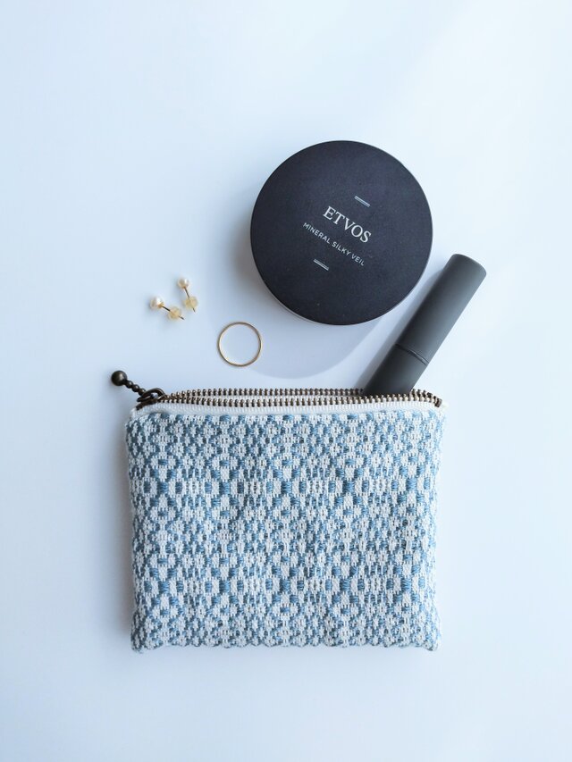 経糸に白い綿糸、緯糸にはくすんだ水色の麻糸(苧麻)を用い、オーバーショット織りでミニポーチに仕立てました。