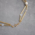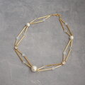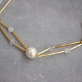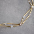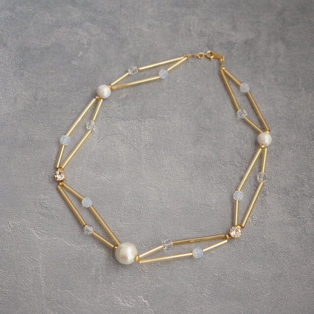 長さの違うビューグルビーズ(ストローのような細長いビーズ)を使って、コットンパールやクリスタルガラスを入れた短めのネックレスです。