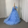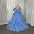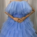 美品!カラードレス ブルー ベアトップ 柔らかく重ねたチュールスカート Aライン 豪華なバックリボン 花嫁