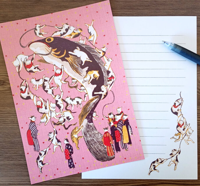 便箋いっぱいに、巨大なナマズとたわむれる猫たちのユーモラスな姿をあしらい、眺めても楽しく、手紙を書く時間が楽しくなる一品に仕上げました。