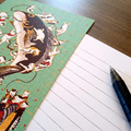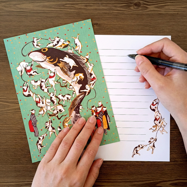 便箋いっぱいに、巨大なナマズとたわむれる猫たちのユーモラスな姿をあしらい、眺めても楽しく、手紙を書く時間が楽しくなる一品に仕上げました。