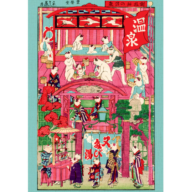 湯屋に集まった猫たちが、湯につかり、くつろぎ、思い思いに過ごす楽しい江戸のひとこまを描いた、遊び心あふれる浮世絵作品。