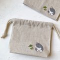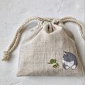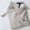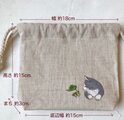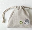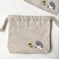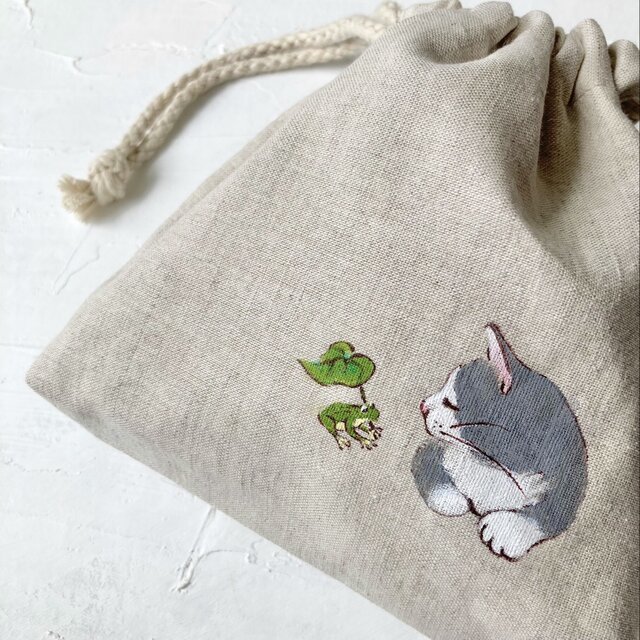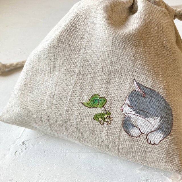 【受注制作】『カエルと猫』手描きコットンリネン巾着 ベージュ グレー猫 ハチワレ猫