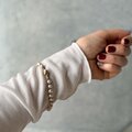 程よい粒の大きさのあるパールで、素肌にはもちろん、薄手のニットやカットソー、ブラウスなどの袖口に合わせて、エレガントに映えます。