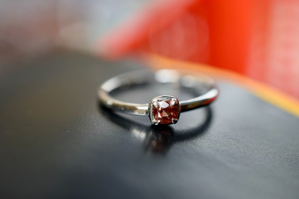 鮮やかで落ち着きのある丹色の四角型スピネルを、シルバーリングにあしらいました。