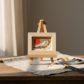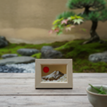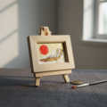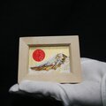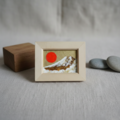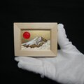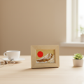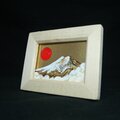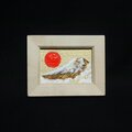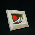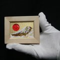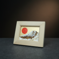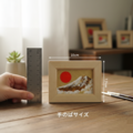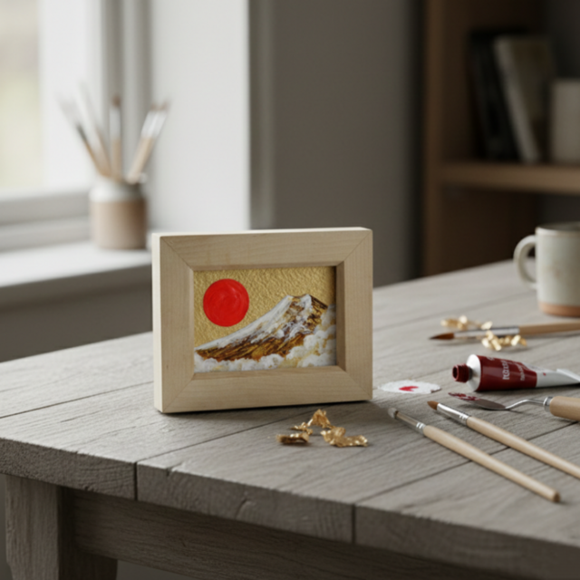 作品の左上には鮮やかな赤い丸が描かれ、昇る太陽のモチーフとして「日本らしさ」を強調しています。この赤が金色の背景に映え、全体のバランスを引き締める重要なアクセントとなっています。また、ミニチュアサイズであるため、どこにでも簡単に飾ることができ、富士山の美しさを日常的に感じることができます。