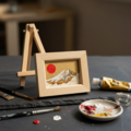 「黄金富士」は、卓上に美しい存在感を放つミニ絵画です。横10cm、縦7.7cm、厚さ1cmというコンパクトなサイズながら、中からあふれ出る魅力は圧倒的です。日本の象徴である富士山をテーマに、ただの写実に留まらない独特な表現が施されています。