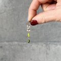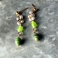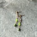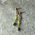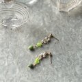 ライムグリーンのアートグラスとフェイクパールが上品にぶら下がるダングルピアス。
