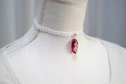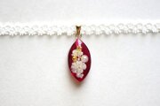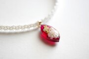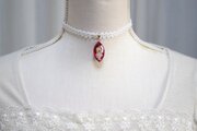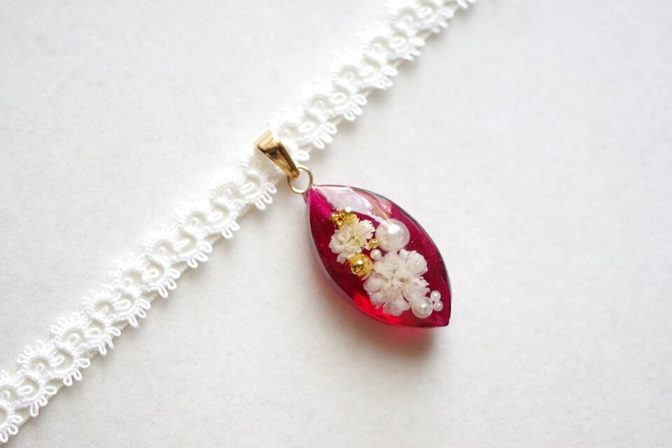 こっくりしたルビーレッドの背景にお花とパール、ブリオンをあしらった可憐なレジンを、サテンリボンにタティングレースで装飾を施したチョーカーに仕上げました。