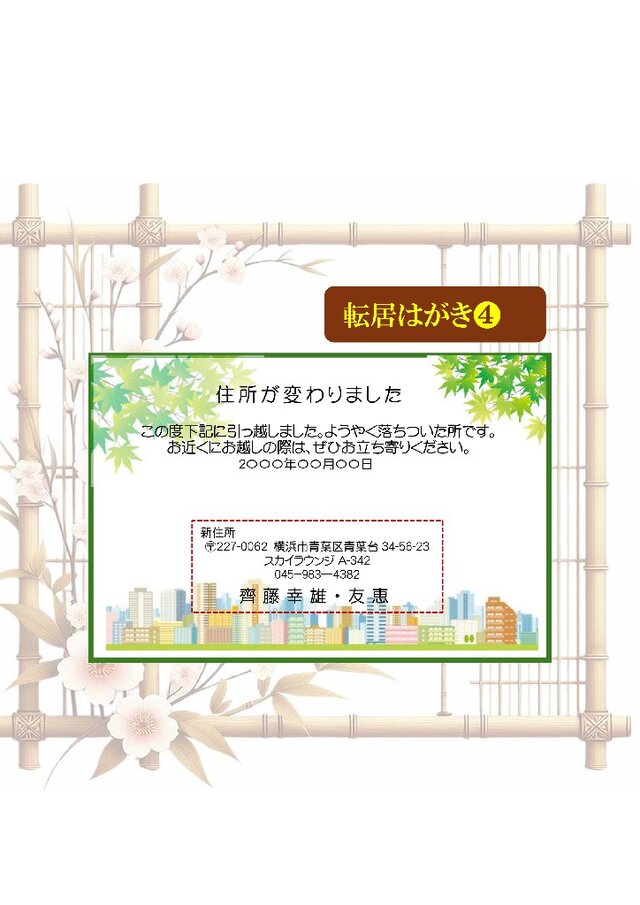 「転居はがき」サービス印刷/官製はがき・15枚コーナー❹/差出人刷り込み・送料無料/内容変更可/