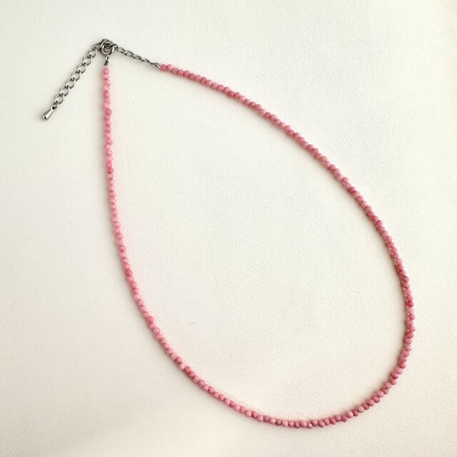 もっと気軽に珊瑚を楽しんでほしいと思い、初めてベビーサイズの珠にスモーキーなピンクの着色を施してネックレスを製作しました。カットボウルにしたことで控えめな輝きもございます。一粒ずつの形が微妙に違う珊瑚を美しく繋ぐ技術もたいへん高度な職人の力によるものです。